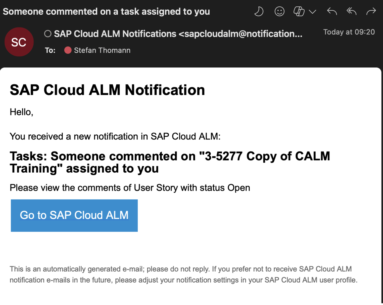 Bevorzugst du es, Informationen direkt in deinem Posteingang zu erhalten? SAP Cloud ALM ermöglicht auch E-Mail Benachrichtigungen, sodass du sofort informiert wirst, sobald eine Aufgabe oder ein Defect von dir Input benötigt.