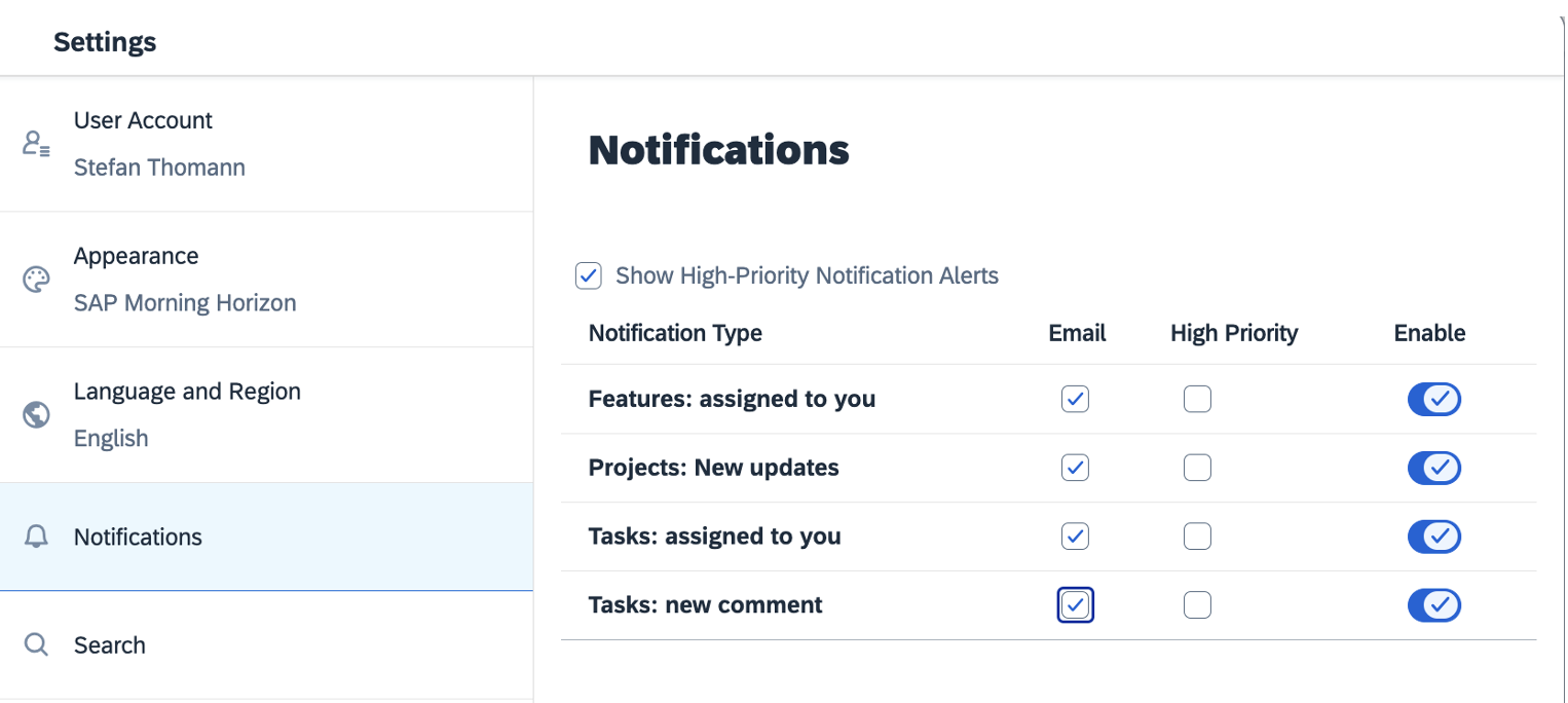 Die Option “Show High-Priority Notification Alerts” hat derzeit keinen Einfluss auf die Benachrichtigungen von SAP Cloudl ALM