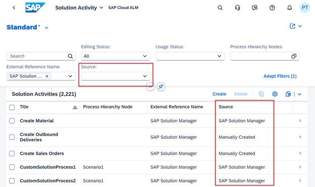 Die erste ermöglicht es, die Liste der Lösungsaktivitäten nach Quelle zu filtern. Dieser Filter hilft dabei, die Lösungsaktivitäten zu identifizieren, die aus einer anderen Quelle, wie z. B. SAP Solution Manager, in SAP Cloud ALM übertragen wurden.