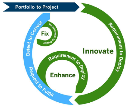 In addition to genuine, unplannable bug fixing (“Detect to Correct“), which we do not take into account here, every company usually has a mixture of smaller enhancements (enhancements as part of “Request to Fulfill“) and larger implementation projects (“Requirement to Deploy“). Unfortunately, these two plannable processes are structured quite differently and there is a risk of incongruent timing of the phases (development, testing, go-live, hypercare).