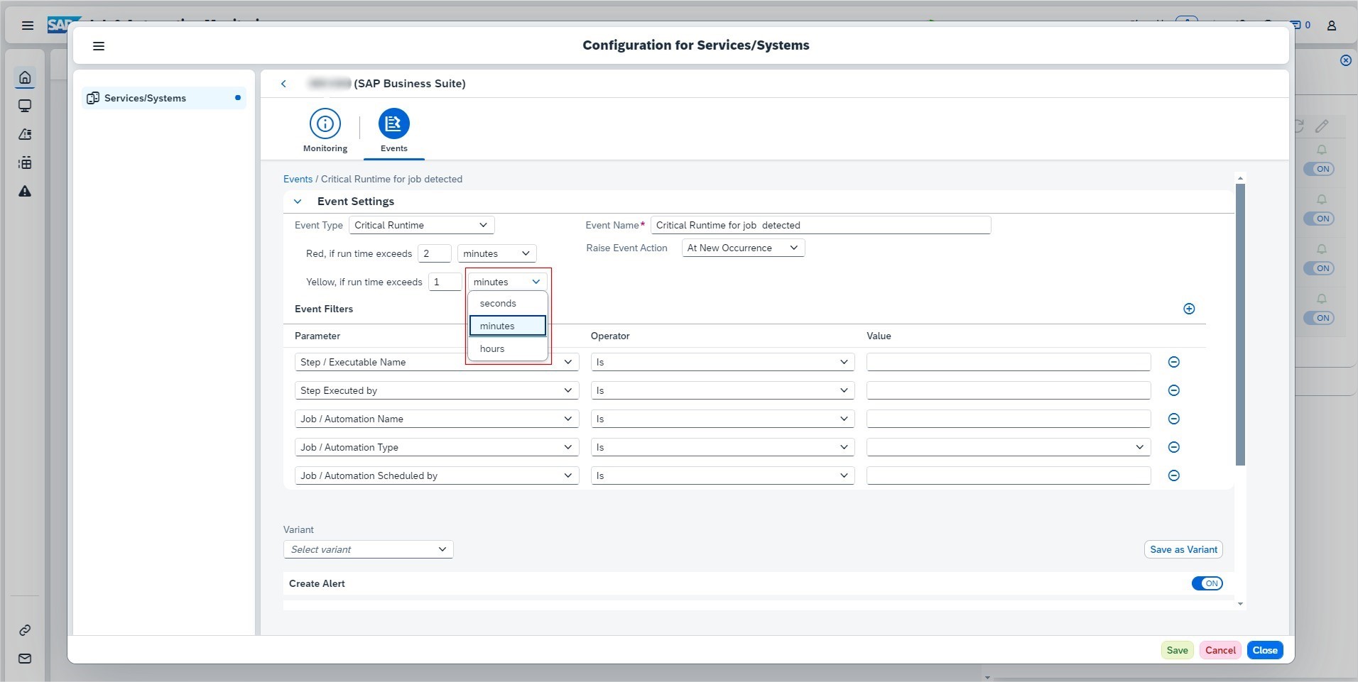 Job & Automation Monitoring now allows to configure Critical Runtime or Critical Delay events to raise event actions when the run time or delay exceeds by a few seconds. Previously, the time was set in minutes.