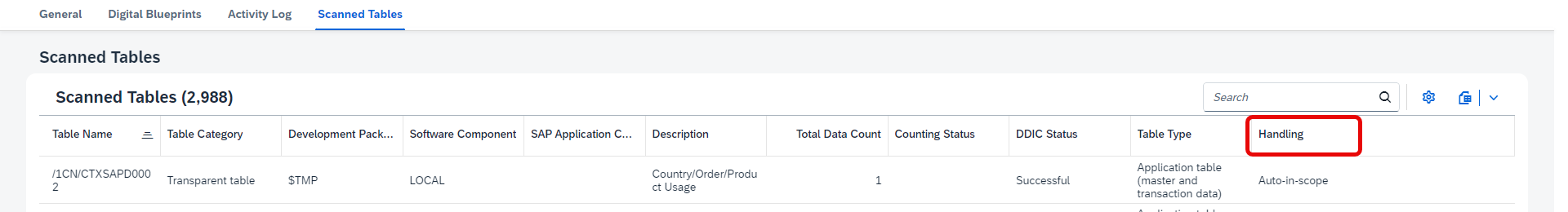 - In the Manage System Scans and Manage Digital Blueprints apps, there is a new Handling column that shows which scanned tables are auto-in-scope and which are scoping-relevant.