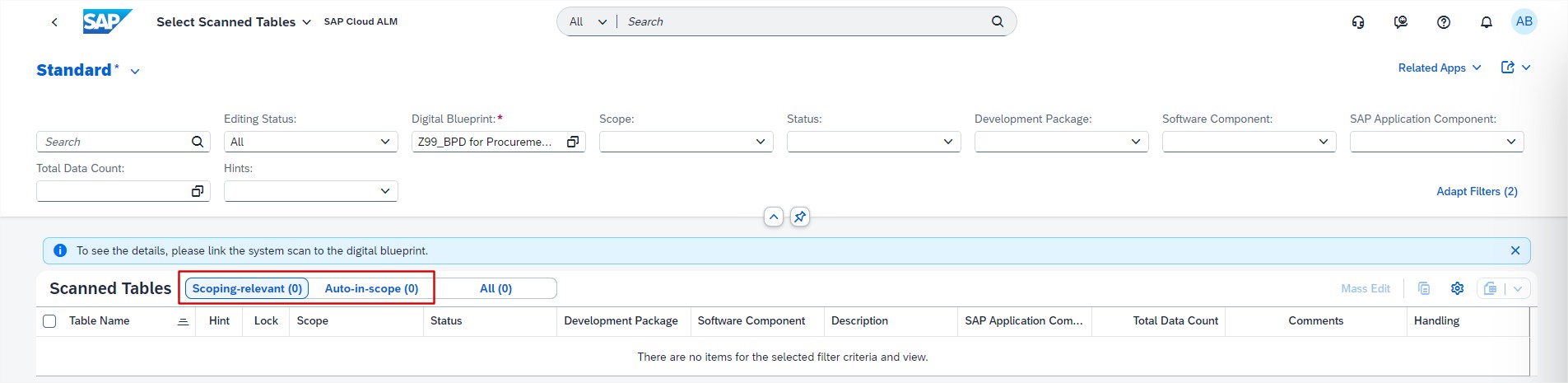 - In the Select Scanned Tables app, it’s possible to filter by auto-in-scope and scoping-relevant tables. Scanned tables that are automatically in scope are locked for scoping.