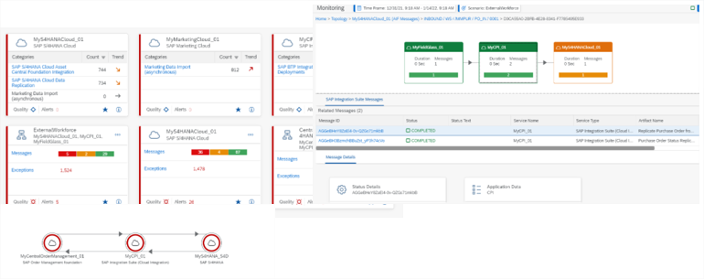 Integration Monitoring collects detailed status overview info per business system on the incoming/outgoing messages for different interfaces with drill down to identify problems, providing so E2E monitoring for message flows across cloud services and systems. Messages can also be tracked by different context attributes. This enables you to ensure reliable data exchange between different systems.