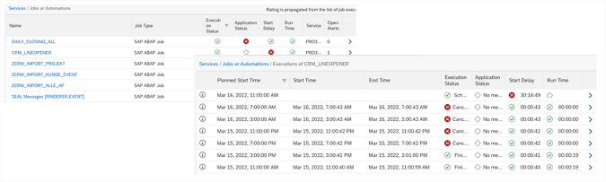 Job and Automation Monitoring collects individual job execution data and evaluates the executions against historical data with a rating. It Checks Execution status, application status, start delay and runtime, providing the current status of the jobs and enabling the root cause analysis to find problems and detect anomalies. Supported are Application Jobs, ABAP jobs, BW process Chains and SAP Intelligent Robotic Process automation jobs.