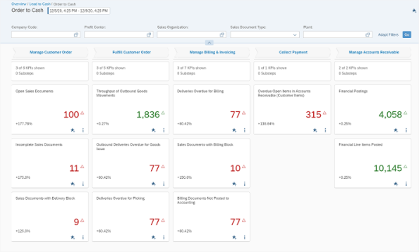 KPIs are evaluated based on the selected timeframe and compared to the previous period Collected data also has drill down capabilities into business documents and alerts can be created from them