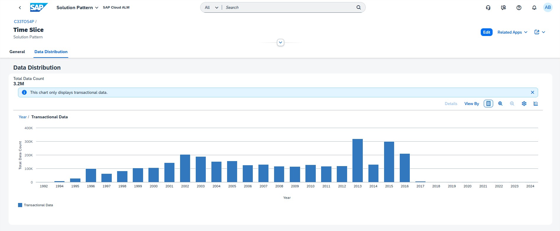 In the Manage Digital Blueprints app, there is a new chart which displays the distribution of transactional data per year. The chart is visible in the Solution Patterns section for time slice. This allows visualizing the impact of a time slice-based data reduction on the scope of digital blueprint and helps to make an informed decision when selecting a year for a time slice.