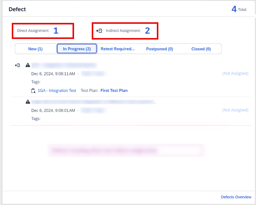 By clicking a bar chart in the Defects column, we can now view defects that are directly assigned to a solution process in the popup. If we also want to see indirect assignments, it’s necessary to enable them by using the Indirect Assignments button.