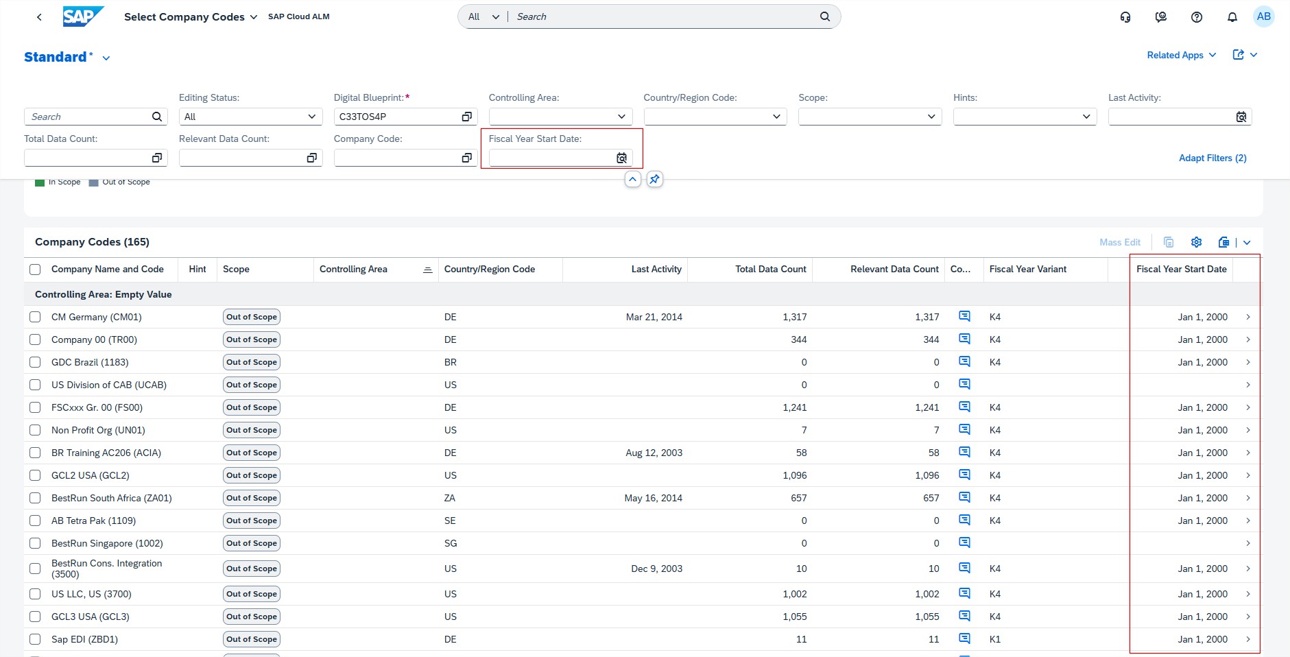 In the Select Company Codes app, it’s now possible to check the fiscal year start date of each company code in the company code list view. This helps to make scoping decisions for a digital blueprint for which it’s planned to activate the time slice solution pattern.