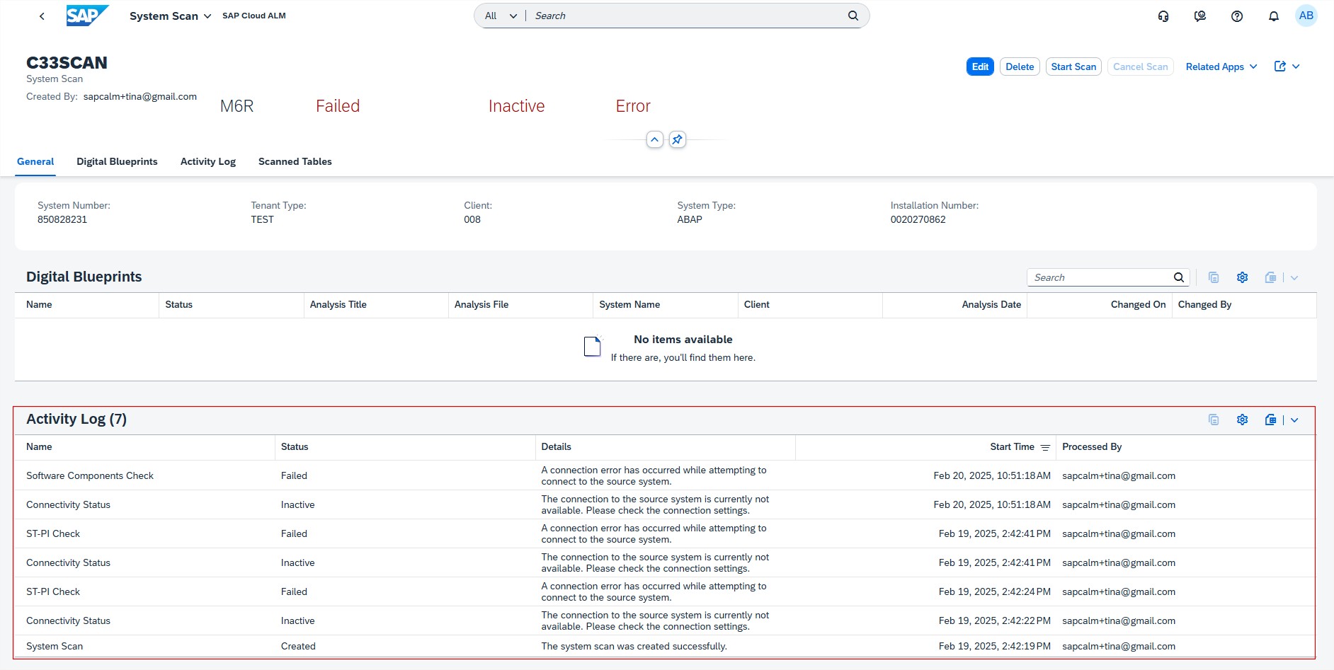 When a system scan fails due to an incorrect setup in the backend system, SAP Business Transformation Center now displays detailed instructions on how to fix the issue. These messages are visible in the system scan´s Activity Log section in the in the Manage System Scans app.
