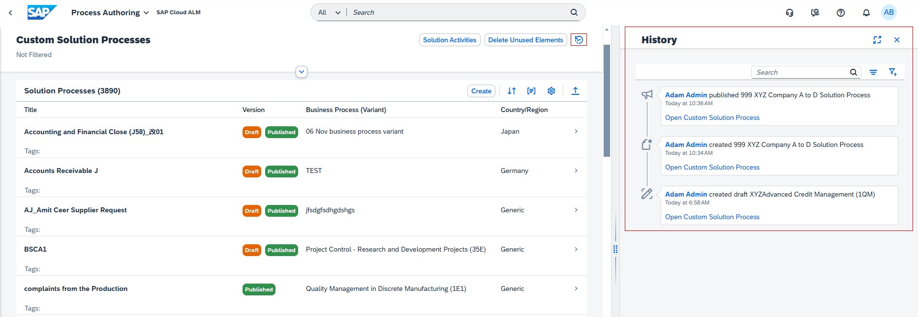 Process Authoring allows now to call up a history of actions from the icon located at the top of the list of custom solution processes. This history tracks every action that has been performed on custom solution process, along with the user who performed the action and the date and time. By default, we see the actions in chronological order with the latest action at the top, but it’s also possible to switch the order to show the oldest first.