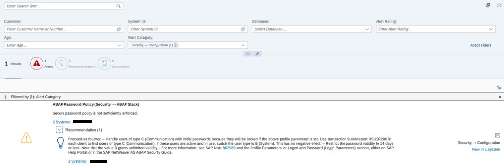 Configuration shows the Security relevant settings as per recommendation by SAP. It will give advice for password policies in ABAP and HANA, it also shows if the SSFS Master Encryption Key of a HANA is not changes. As in every category SAP gives direct access to documentation and Notes with hints and documents on how to set up everything in a secure way.