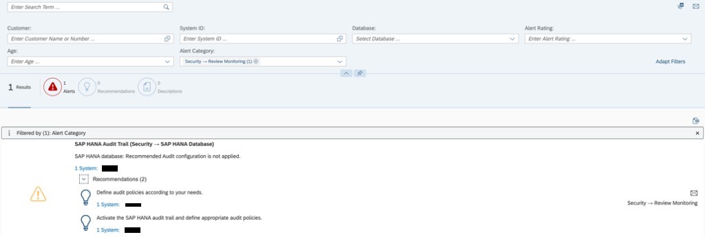 In Review and Monitoring SAP checks for the configuration of the Audit logs in SAP HANA.