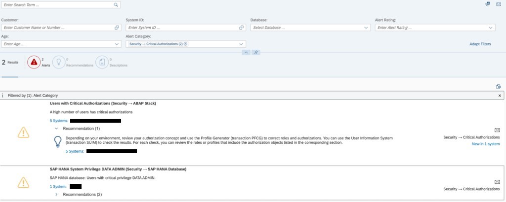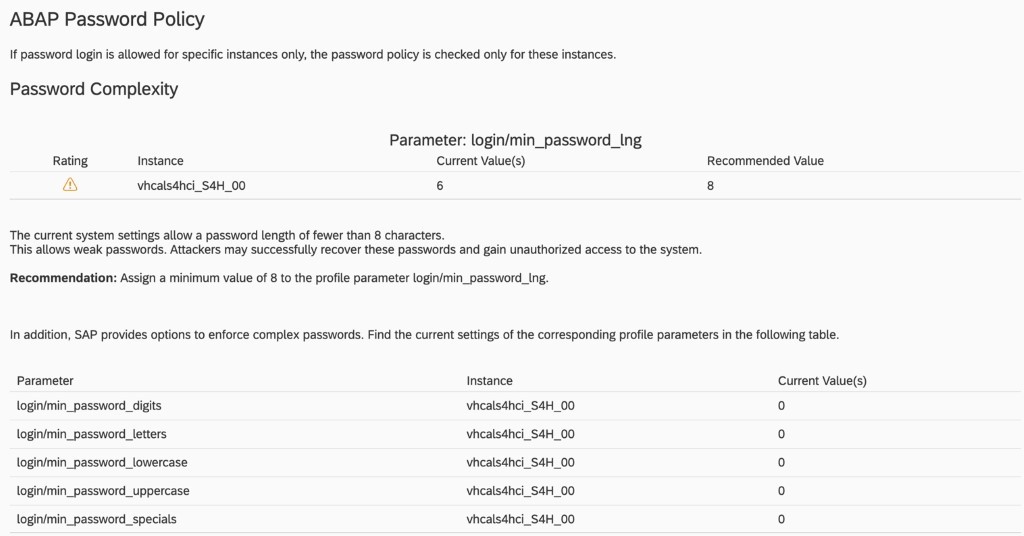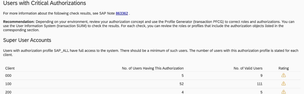 This category checks for users with authorizations which they shouldn’t have in an SAP environment. It checks for Roles like SAP_ALL in ABAP or DATA_ADMIN in HANA.