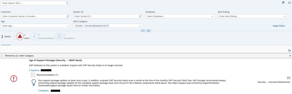 The maintenance category gives adives for the latest support packages or notes which should be implemented to run a most secure SAP Landscape for ABAP, JAVA and HANA