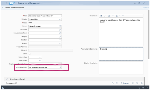 I am not yet sure whether I should really be happy about the next small change: Now I have convinced many people that the requirement does not yet have a project assignment and that this is only created with the assignment to a work package – fortunately, this is still the case in principle. However, there is now the possibility to fill in the planned project as an info field in the requirement. This is good news for all those who have so far helped themselves with naming conventions in the requirement title and so it is of course easier to carry out early product backlog planning, e.g. to estimate the required resources for a planned build project or a workstream and to set them already.