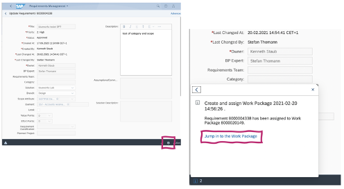 A second practical jump can now be found directly in Requirements Management: After creating the work package, you can jump directly to the newly created work package via the notifications and thus save the clicks via the requirements overview, which always took you out of the “flow” in the past.