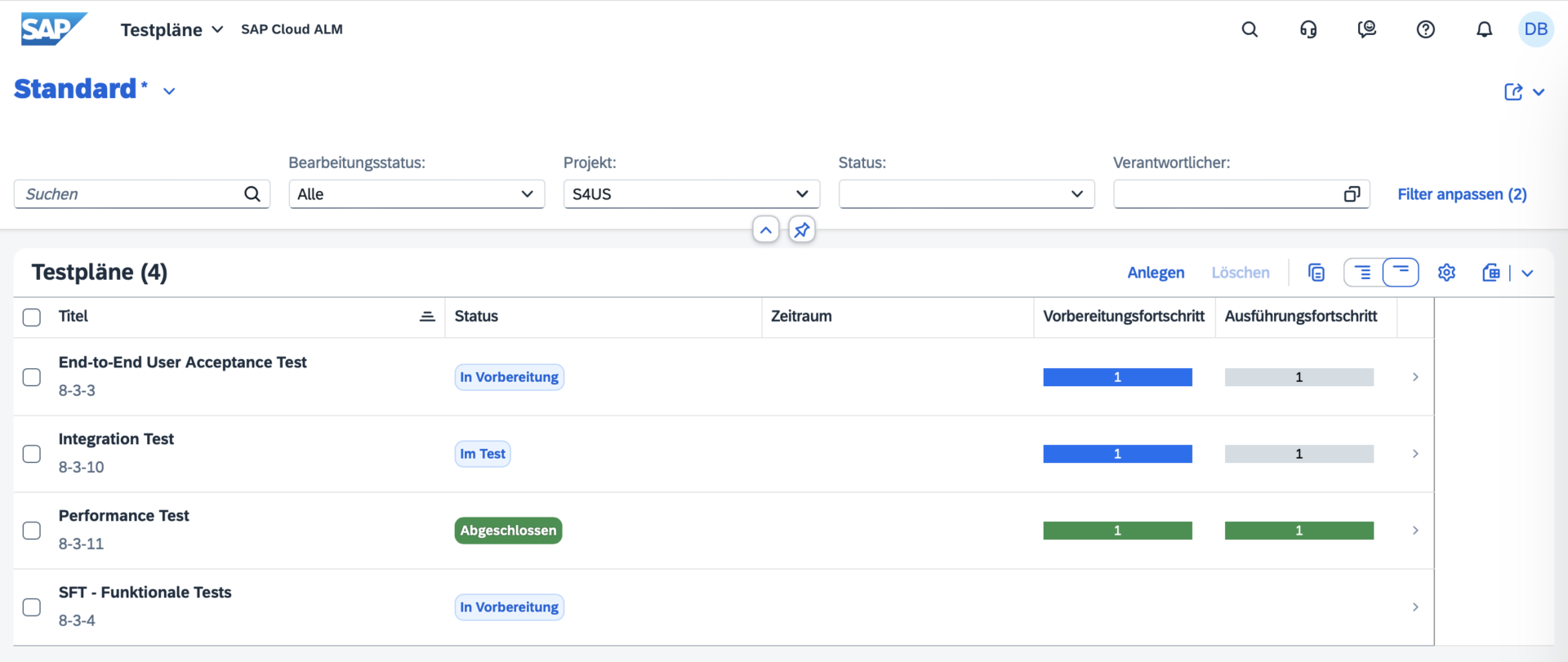 Das Testplanungsmodul ermöglicht es dir, Testzyklen über mehrere Organisationen hinweg zu verwalten. Ein wichtiger Unterschied zum Solution Manager ist, dass es hier keine Testpakete gibt.