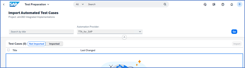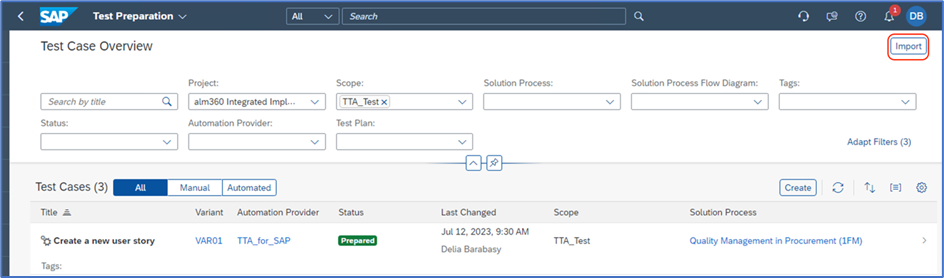 Click on the “Test preparation” tile in SAP Cloud ALM and then on “Import”: