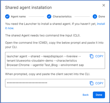 - Paste the first line into the prompt, and when prompted, paste the second line (the client secret) as well. As soon as you are finished, press Done. Your shared agent is now installed and connected.