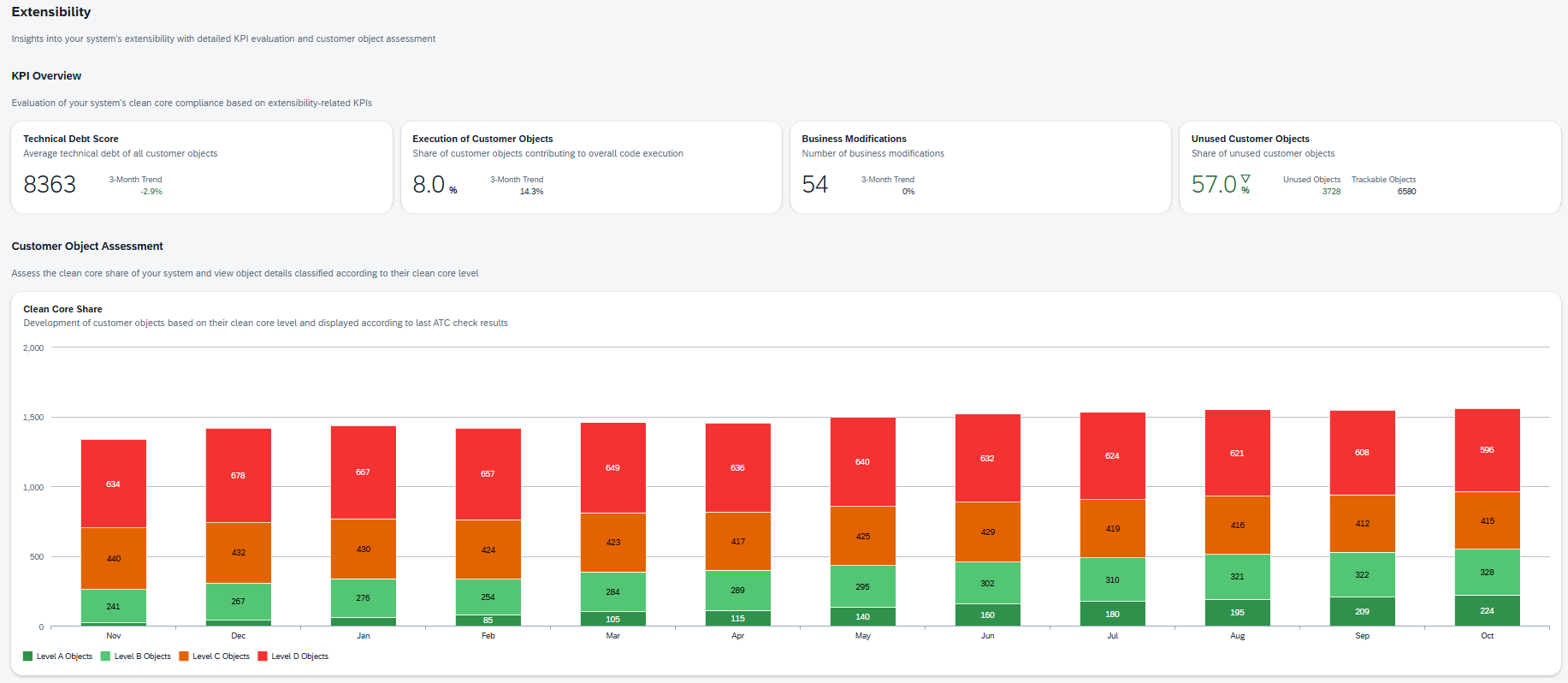 Über den Reiter „Extensibility“ in der Systemansicht führt das Auswählen der Level B Objects, Level C Objects oder Level D Objects-Karten nun direkt zum Customer Objects Dashboard. Die Daten werden dabei automatisch sowohl nach dem ausgewählten System als auch nach dem gewählten Clean Core Level vorgefiltert. Dadurch wird ein nahtloses Drill-down von den übergeordneten KPIs bis hin zu den objektspezifischen Ergebnissen ermöglicht.