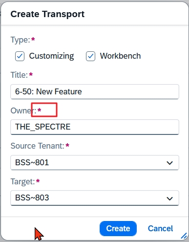 If you prefer to avoid the error-prone creation of the transport from within the feature, you should, as suggested previously, create transports in the system and then assign them to the feature. The transports are thus automatically assigned to the correct user and target the correct system. However, there is a certain risk that chaos will ensue.