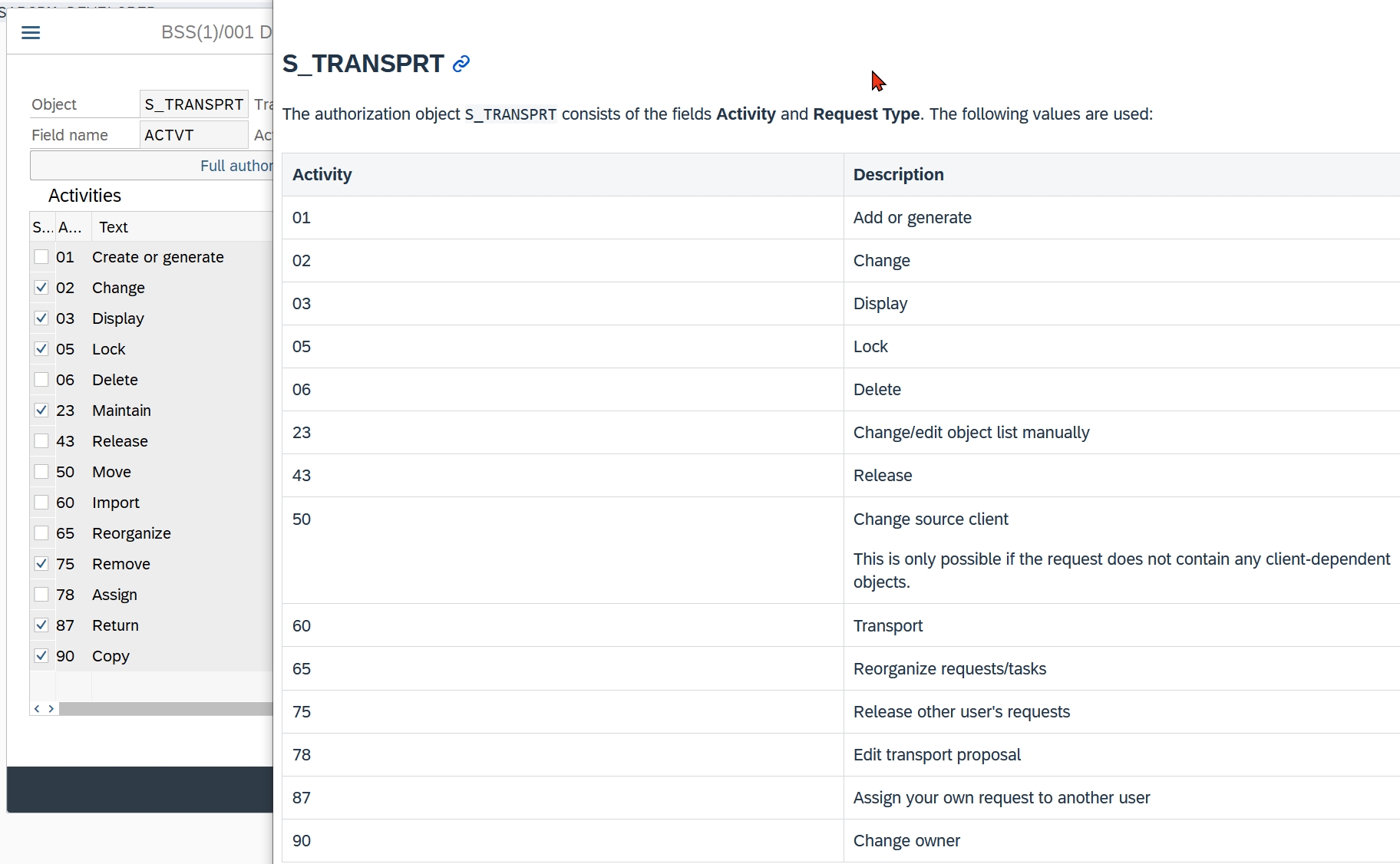Some descriptions of the actions in the PFCG value help are confusing. For example, who would guess that ACTVT=75 “Remove” means that you can release another user’s transport? A complementary explanation of the possible values for the actions can be found here.