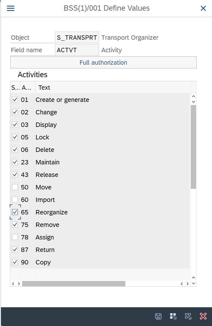 Since S_SYS_RWBO offers exactly the same values for the ACTVT and TTYPE fields, I will focus here on the S_TRANSPRT object, but be careful! If S_TRANSPRT only allows display (ACTVT=03), the system additionally checks S_SYS_RWBO to see whether an action is permitted for the respective system after all. This means that you always have to maintain both.