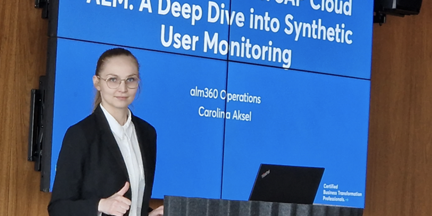 From blue.works, Carolina took the stage this year and did a deep dive into Synthetic User Monitoring – the powerful monitoring use case in Cloud ALM that uses the Selenium infrastructure. The presentation started quite heavy on the technical theory, but things picked up when we got to the live demo. She showed different monitoring scenarios that we are using for our customers – like monitoring an ABAP RFC connectivity through webgui; monitoring different metrics on a JAVA systems NWA; checking our website performance and if the “contact us” form is working. This also included examples where multiple systems are connected into one scenario, so with one check, we get the data on multiple systems. Real E2E monitoring!