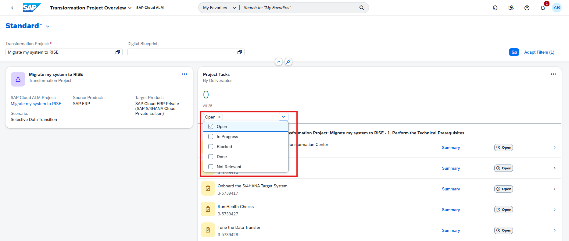​The Transformation Project Overview app now offers refined task lists, status filtering, phase tracking, and direct navigation to related apps for better end-to-end project visibility.