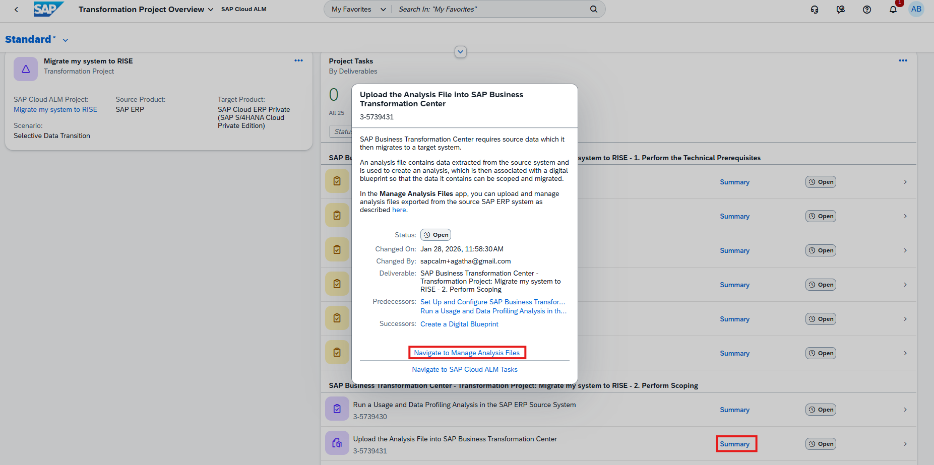 ​Each relevant task also includes direct navigation links to the corresponding apps, enabling seamless transitions between the Transformation Project Overview and the Scoping, Modeling, or Cycle & Monitoring apps.