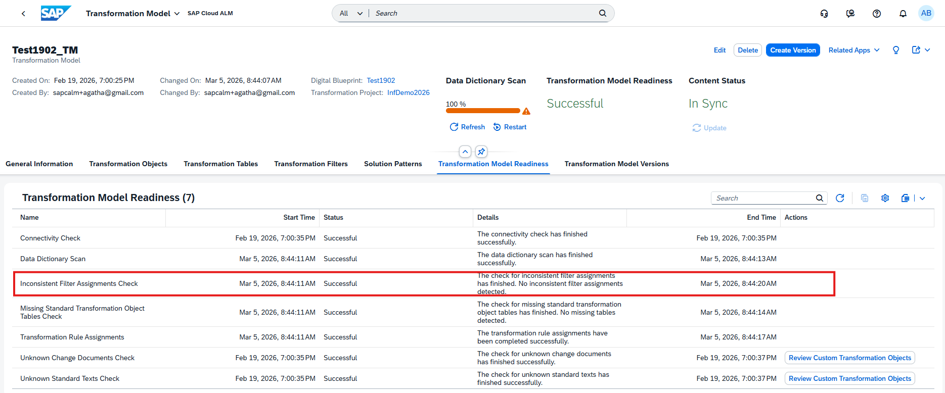The new Inconsistent Filter Assignments Check automatically identifies filter assignments that reference nonexistent SAP ERP table fields. When such inconsistencies are detected, the system excludes them from the scope of the transformation model version. This prevents potential issues during migration execution while keeping the transformation model version executable.