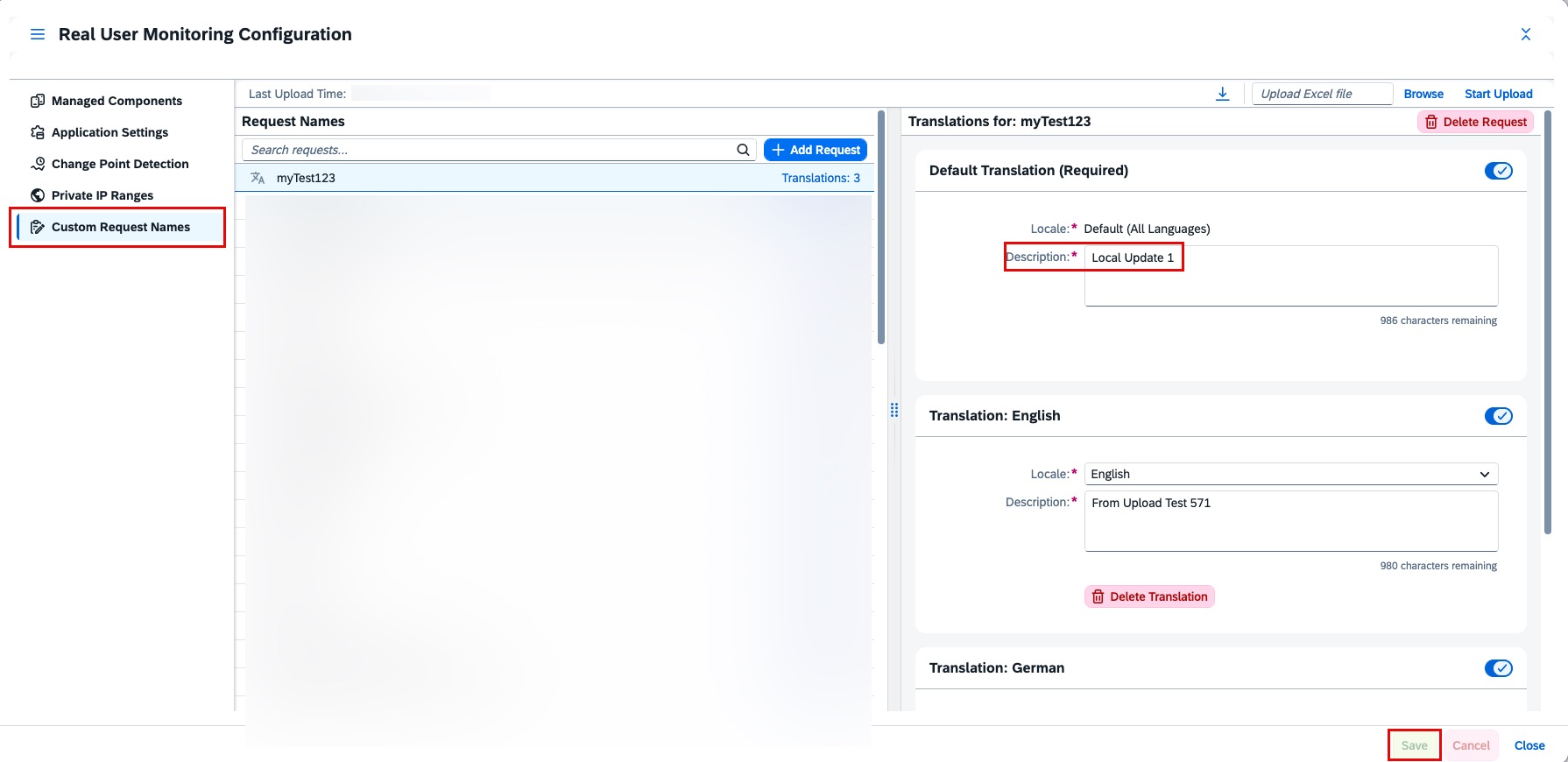 In Real User Monitoring, it is now possible to add a custom description to request names in the Configuration screen. This enhancement helps provide additional context and improves clarity when analyzing monitored requests.