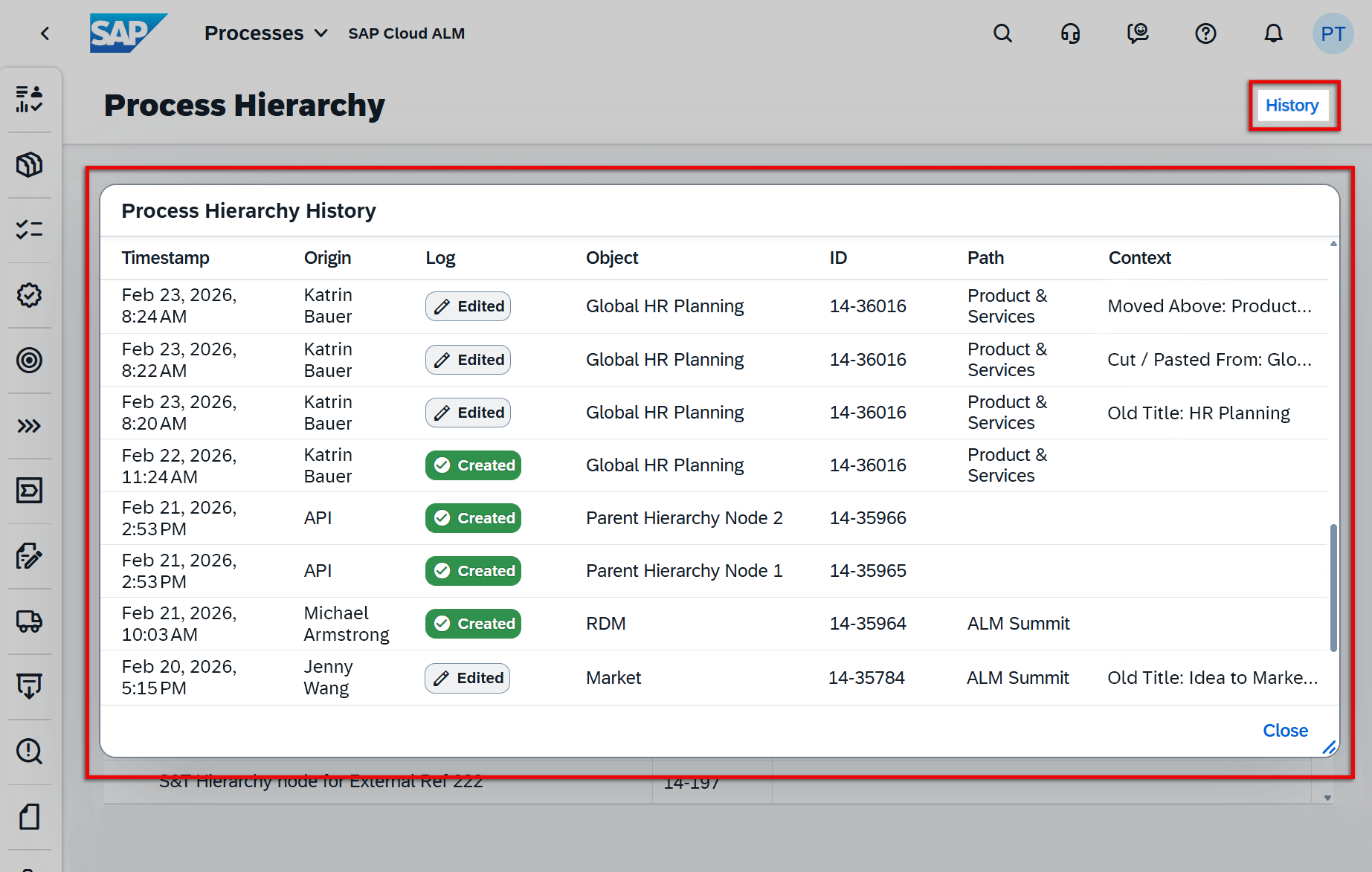 In addition, the Process Hierarchy app now includes a history function that records changes made to process hierarchy nodes. The history shows when a change occurred, what was modified, and who performed the change (unless executed via API). Changes made through the UI, public APIs, or spreadsheet uploads are all tracked, improving traceability and governance of process structure updates.