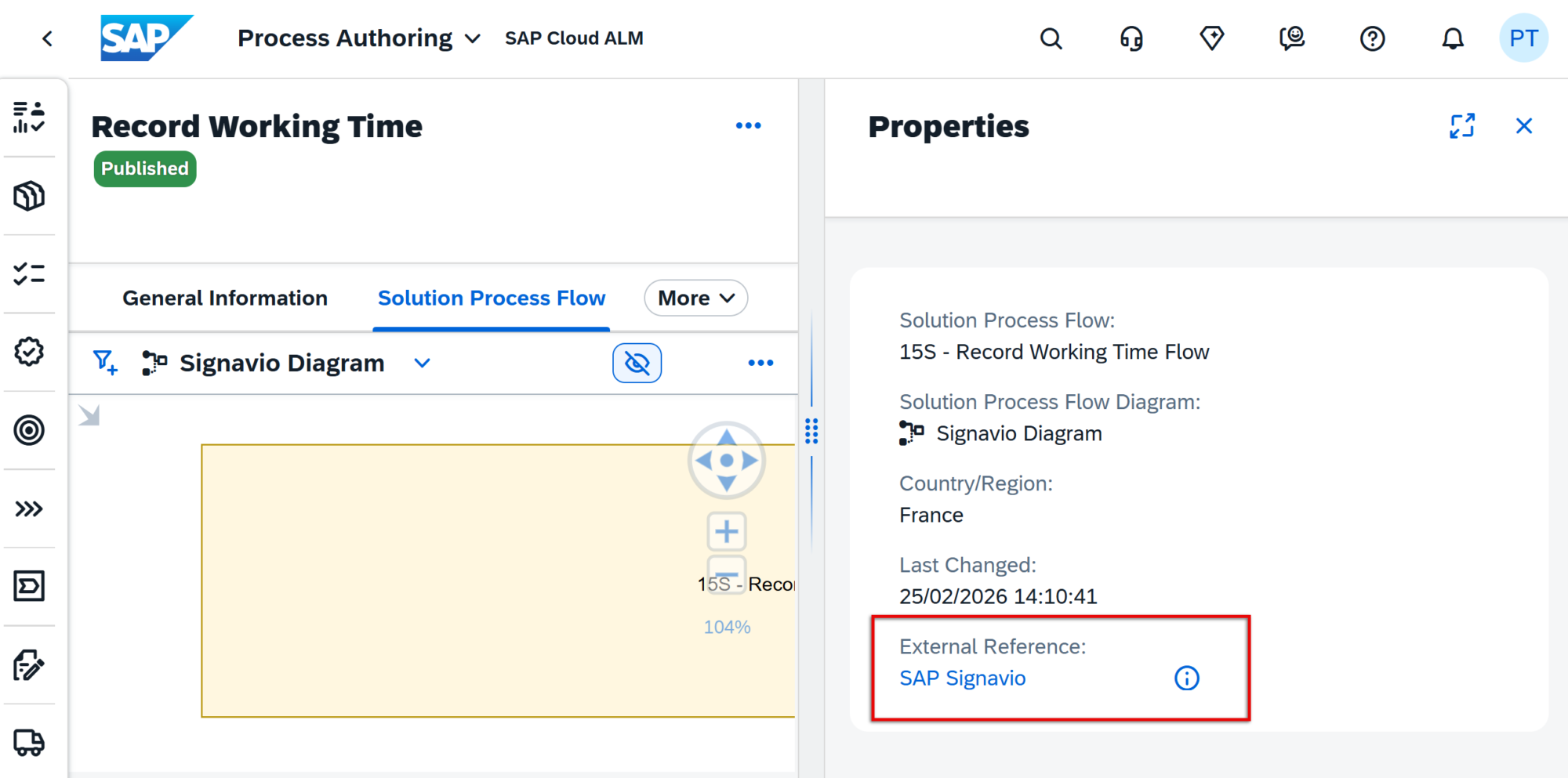 If a diagram contains an external reference, it is now displayed in the Properties section when the diagram is selected in Process Authoring. The external reference name appears as an active link, enabling direct navigation to the referenced source.